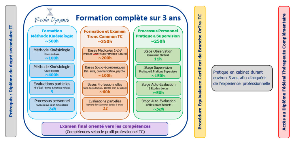 La formation est donc divisée en deux grands modules, celui de la kinésiologie, et celui du tronc commun (compétences communes à tous les thérapeutes complémentaires). Une troisième partie est axée sur l’aspect “processus personnel” qui, outre la pratique supervisée, est orientée développement personnel et réflexion individuelle.